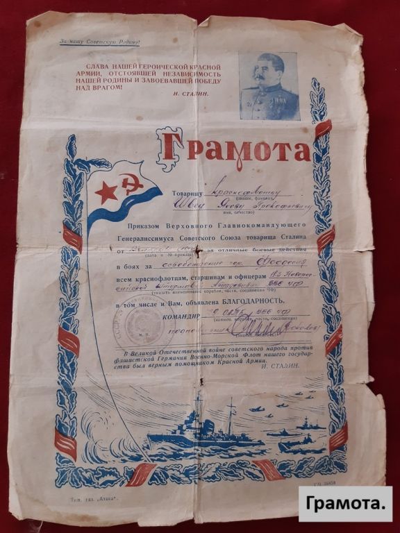 Товарищу краснофлотцу Швец Якову Прокофьевичу. Приказом Верховного Главнокомандующего Генералиссимуса Советского Союза товарища Сталина от 13 октября 1944 года за отличные боевые действия в боях за освобождение города Феодосия всем краснофлотцам, старшинам и офицерам 11-й Новороссийской штурмовой Авиадивизии ВВС УФ в том числе и Вам, объявлена благодарность.